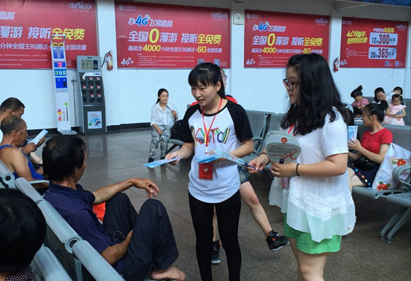 7月2日上午,麗水學院志愿者在客運東站候車廳進行防治艾滋病的宣傳工作。為了把工作做的扎實有效,讓更多的人了解艾滋病的傳播途徑和預防艾滋病的重要性,志愿者們向正在等車的旅客贈送清涼扇和宣傳資料,扇子上印有預防艾滋病相關知識,既給旅客送去清涼,又達到了宣傳預防艾滋病的目的。