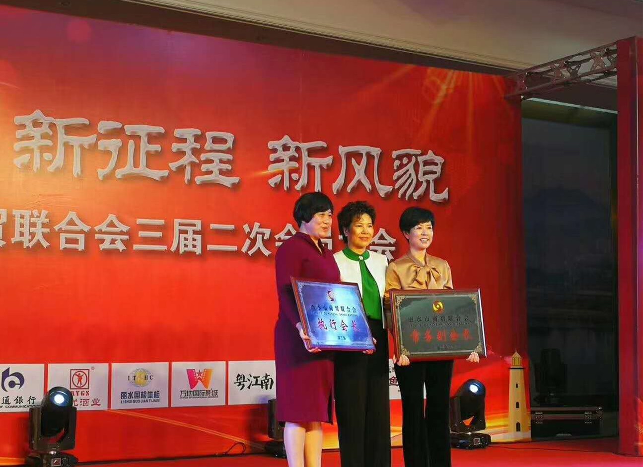 3月30日,市商貿聯合會三屆二次會員大會在麗水九城宴會中心隆重舉行。 集團公司工會主席呂麗君當選市商貿聯合會第三屆執行會長,麗水市市委常務、統戰部部長任淑女授牌。