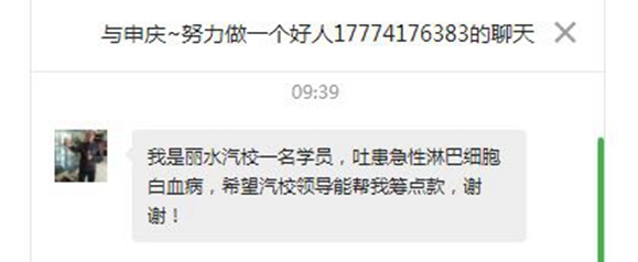6月27日,麗汽集團汽車技術學校的微信公眾號收到一條來自學員的消息:“我是麗汽汽校的一名學員,突患急性淋巴細胞白血病,希望汽校領導能幫我籌點款,謝謝!”