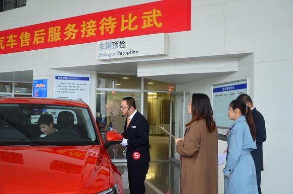 在下午進行的售后接待比武項目中,主要設置了禮迎客戶、環車檢查、唱檢車檢項目、車輛問診、簽訂委托書等環節,考察選手對維修接待崗位工作技能的熟悉程度和解決實際問題的能力。選取服務接待的典型工作任務--常規保養接待,要求選手按照真實工作情境接待顧客并做好服務。