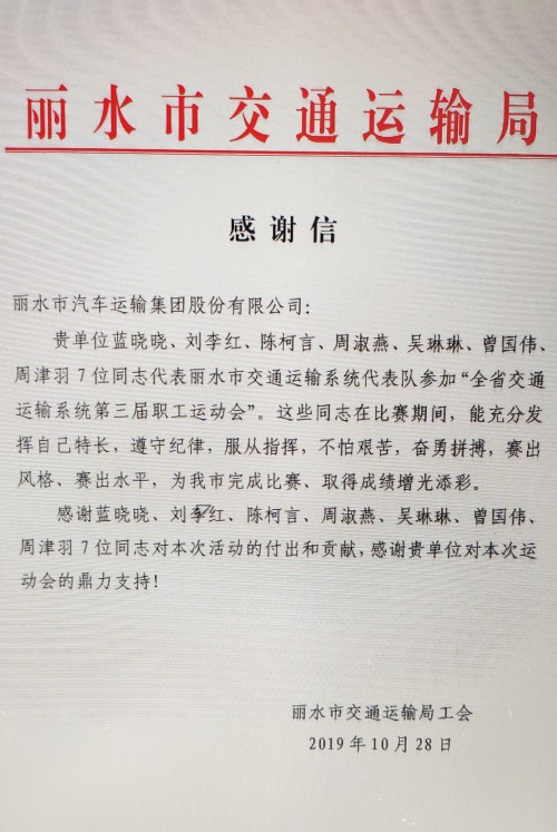 2019年10月24日,麗汽集團藍曉曉、劉李紅、曾國偉等員工參加浙江省交通系統第三屆職工運動會,本屆運動會麗水市交通局代表隊共派出28名運動員,其中麗汽運動員7名。