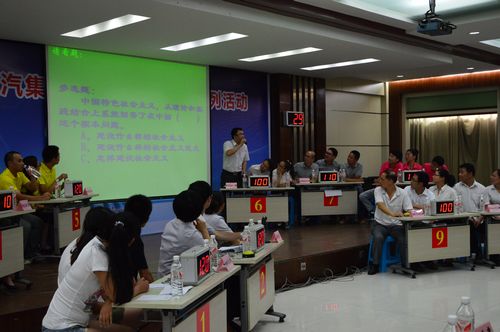 “十八大報(bào)告指出:要建設(shè)什么樣的馬克思主義執(zhí)政黨------搶答開始?!彪S著主持人的一聲令下,最吸引眼球的搶答環(huán)節(jié)開始了。10支代表隊(duì)快速摁下?lián)尨鹌?,這里比的不僅是黨史知識,更是快速反應(yīng)的能力。40道搶答題,有的隊(duì)反應(yīng)快速,答題準(zhǔn)確,加上10分;有的隊(duì)答題心切,違規(guī)搶答,被倒扣分?jǐn)?shù);有的隊(duì)搶到了,答題不是很準(zhǔn)確,也被倒扣分?jǐn)?shù)。臺下黨員隨著他們的表現(xiàn)一會會心一笑,一會兒加油鼓掌,全場氣氛熱烈。