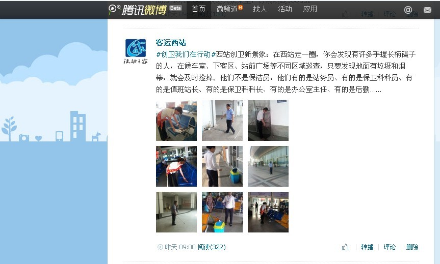 根據麗水市創建國家衛生城市工作領導小組辦公室《關于利用微博做好創衛宣傳工作的通知》,麗水客運西站積極響應,并與8月21日在客運西站騰訊微博賬戶開通“創衛我們在行動”專欄和“健康知識”專欄。