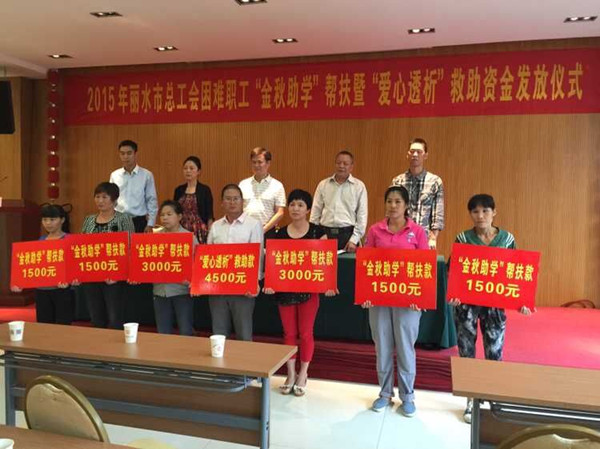 9月18號下午三時,2015年麗水市總工會困難職工“金秋助學”幫扶暨“愛心透析”救助資金發放儀式在市總工會三樓會議室里舉行,麗汽集團5名困難職工獲救助。