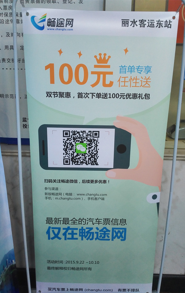 中秋、國慶即將來臨,為了方便旅客購票,從9月22日至10月10日,客運東、西兩站和暢途網開展了“慶中秋、迎國慶”網絡購票送優惠活動,首次下單送100元優惠禮包(100元=50*1+20*1+10*2+5*2;每張優惠券有效期90天,共計6張券)。詳見兩戰售票廳海報。