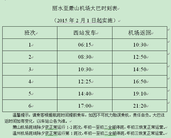為更加方便市民出行需要,從2月1日起,麗水到蕭山機場的客運班車從原來的4個班次增加到6個班次。每天的6:15、8:30、10:30、12:25、14:40、17:00從客運西站發車,蕭山機場則在每天的10:30、12:50、14:50、16:50、19:10和21:20返回。需要到蕭山機場的乘客只要在客運西站售票窗口、銀聯卡自助售票機或現金自助售票機上買票上車即可。