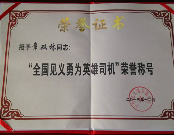 今年7月份,經過蓮都區公安分局、麗水市公安局和浙江公安廳的層層推薦,章雙林通過初評,入選60名見義勇為英雄司機候選人(群體)。10月23日0時至11月22日24時進行了網絡投票,最終順利入選“全國見義勇為英雄司機”,成為浙江省獲得十二屆“昆侖獎”全國十大見義勇為英雄司機的兩位英雄司機之一。(另外一名是湖州市安吉縣遞鋪鎮赤芝村村民,司機王剛。)