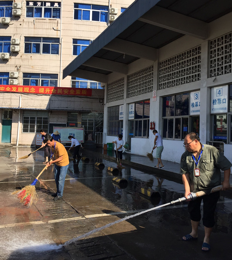 為了迎接24日至26日省專家的文明城市檢查,7月22日下午3時,東站黨員骨干志愿者們頂著41度的高溫,在江小華書記的帶領下,主動放棄休息時間,帶著消防水帶、掃把等工具,對發車區進行了徹底的清洗。