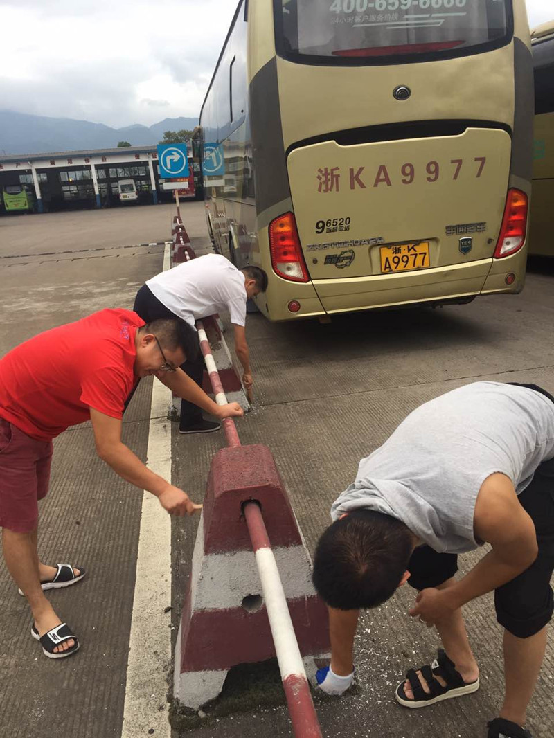 站場內的隔離設施由于長時間的日曬雨淋,出現了嚴重的油漆脫落現象。8月31日早上6點,志愿者們又拿來鋼絲刷,先把隔離墩上還沒脫落完的油漆刷干凈,再用調好的油漆,重新粉刷隔離設施。