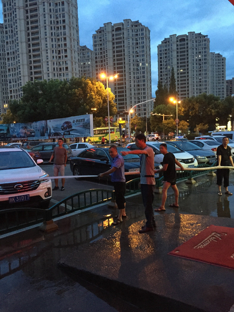 由于白天旅客進出較多,不方便沖洗,志愿者們就選擇客流相對少的時間傍晚下班時間,他們拿來掃把、水帶,對南門周邊的場地進行了徹底的沖洗。對一些“疑難雜癥”如油漬多的地面,隊員們就灑上洗衣粉,用長柄刷子刷洗后,再用水沖洗干凈。一個多小時后,夜幕已經降臨,但看著變得更加整潔的地面,志愿者們依舊持續工作著。